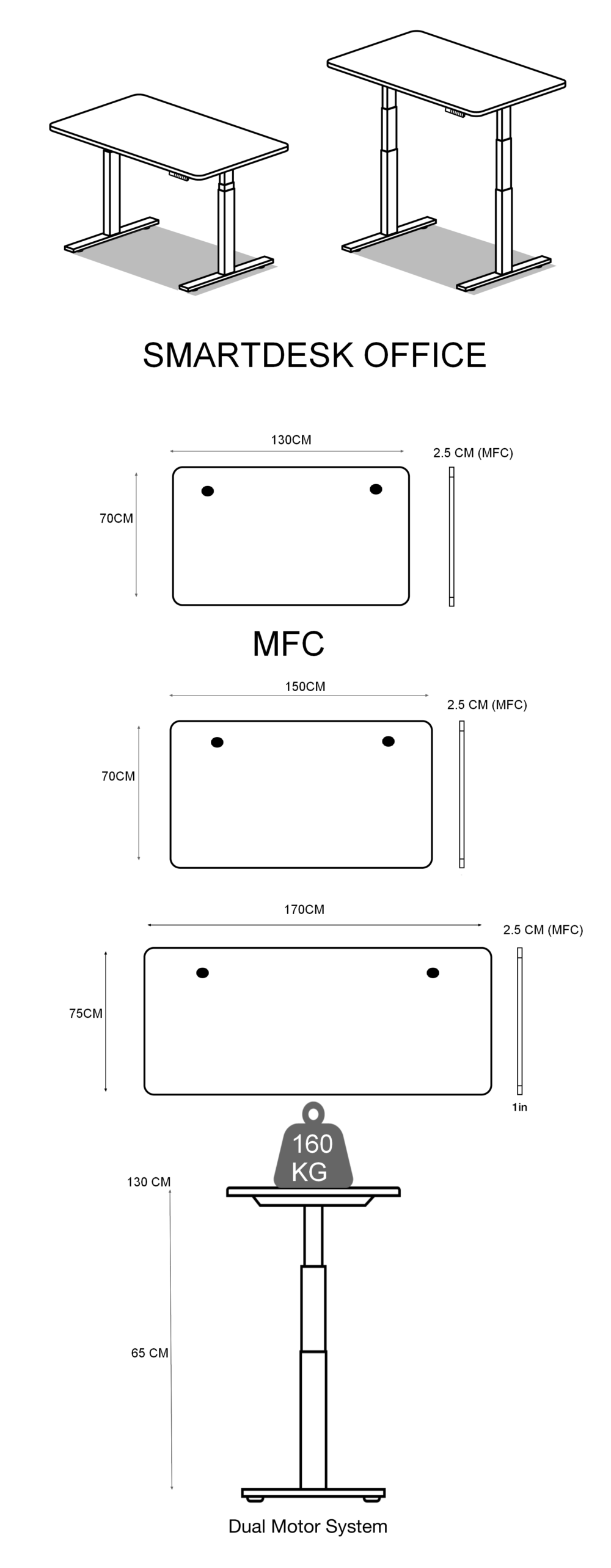Điều chỉnh từ 65cm lên đến 1m30 . Phù hợp mọi tư thế đứng ngồi làm việc .